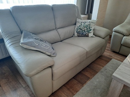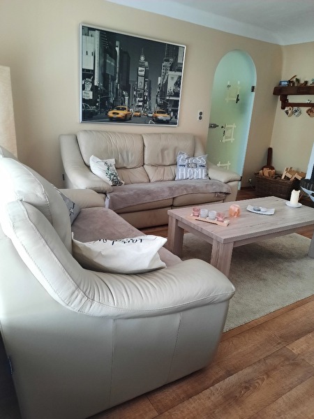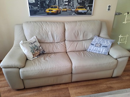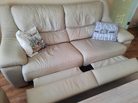 3-zit met 2 relaxen en 2-zit zonder relax. Family friendly leder, zandkleur. Nog in goede staat. Gekocht in maart 2017, merk Chateau d'ax.