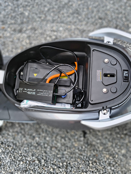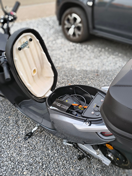 - Opbergruimte onder het zadel boven de accu
