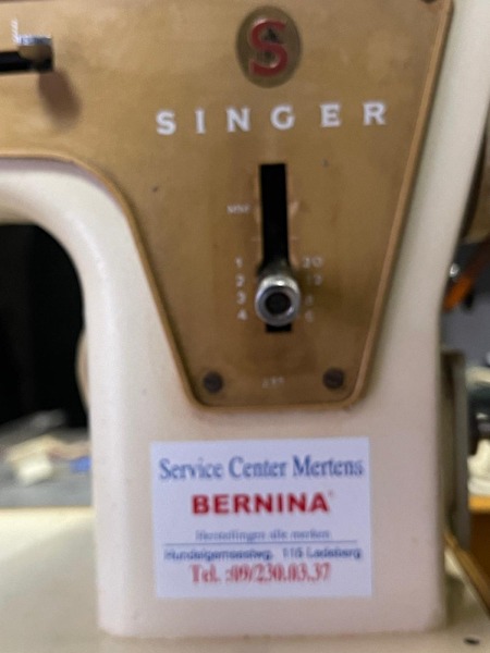 De machine heeft een instelbare steeklengte en een typisch robuuste Singer-mechaniek. Er is een onderhoudssticker aanwezig van Service Center Mertens (Bernina), wat erop wijst dat het toestel ooit professioneel is nagekeken of onderhouden.