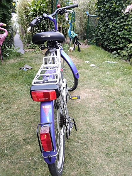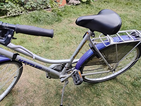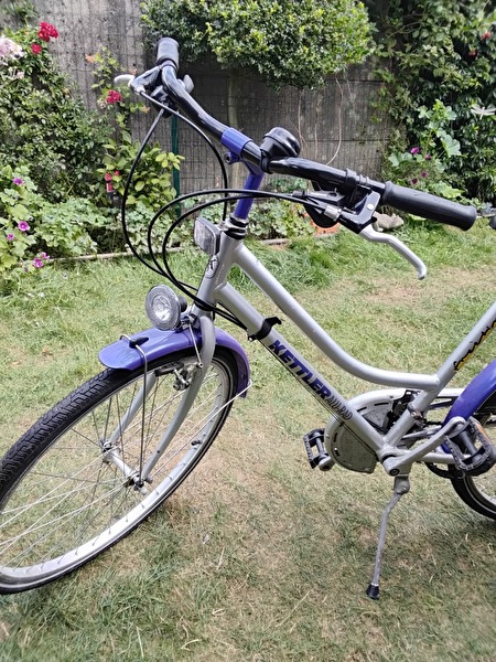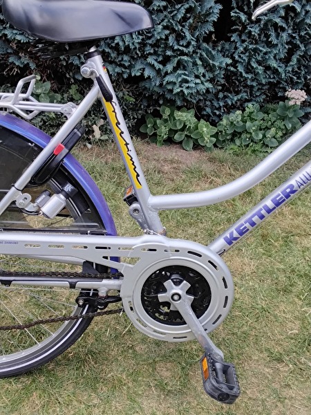 Damesfiets Kettler in goede,sterke staat. Verschillende versnellingen (Shimano) Ketting moet nagekeken worden. Spatbord aan zijkant. Fiets voor mensen met kleiner gestalte.