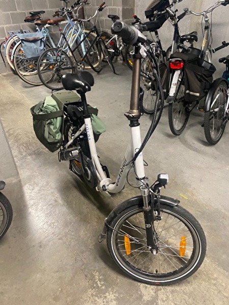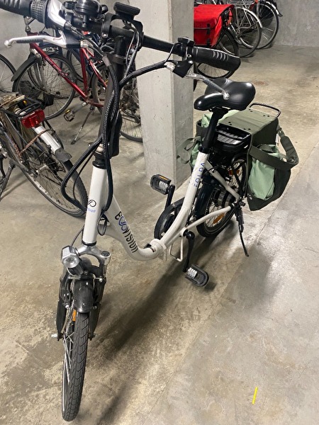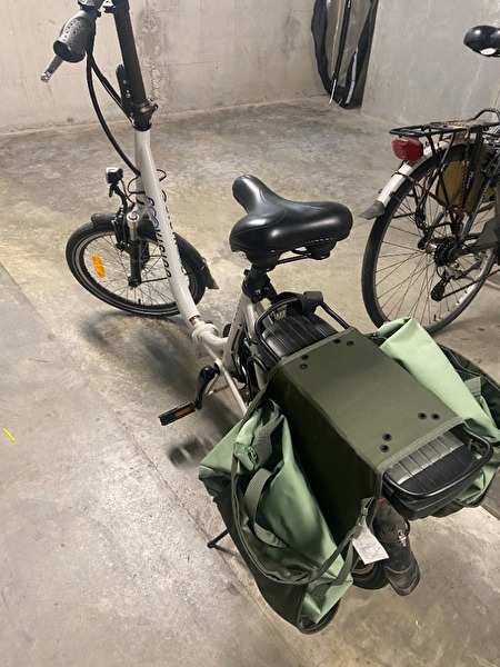 kleine elektrische plooifiets, met twee zijdelingse boodschappentassen.