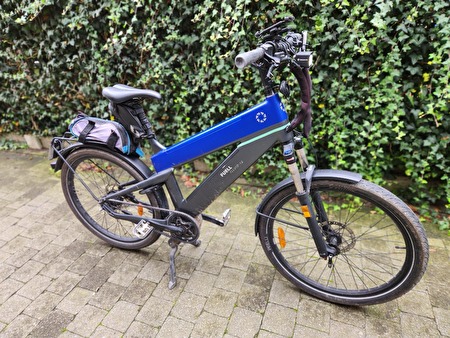 Elektrische fiets 45Km. Kleur grijs-blauw. 2 Batterijen van 500Kwh. Gates Carbon riemaandrijving onderhoudsvrij.