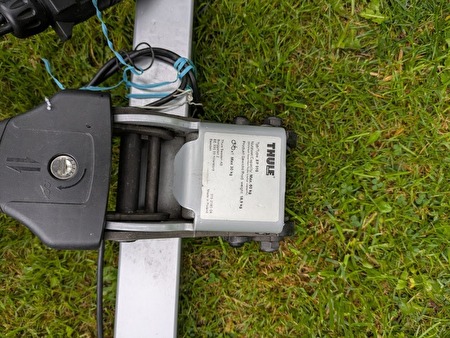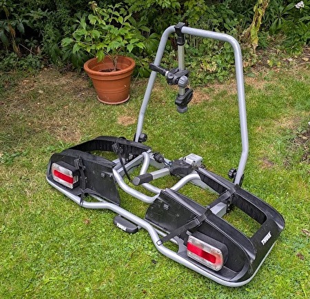 De fietsendrager is in goede staat: enkele kleine krassen op het frame en beperkte slijtage van het kantelmechanisme (bij langere ritten met zware fietsen: fixeren met spanband).