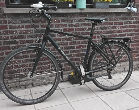 Verende voorvork, verende zadelstang, bekrachtigde remmen, Shimano versnellingen aan het stuur, dynamo in het wiel, achterlicht met bewegingsmelder en schemerschakelaar.