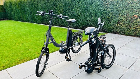 Twee elektrische vouwfietsen, ideaal voor in de camper, caravan, boot, achter in de auto.Lage instap, middenmotor BAFANG 250 W, wielen 20 inch, Schwalbe anti-lek, hydraulische velgremmen, Shimano naafversnelling 8, Batterij 14,5 A h/36 V uitneembaar.