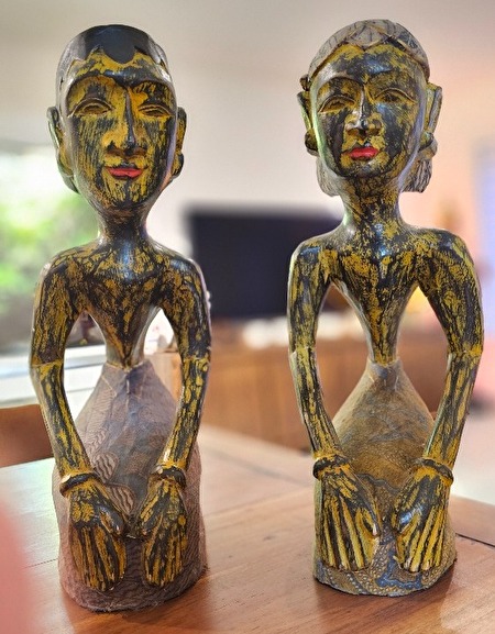 Traditionele Javaanse Wayang Golek-figuren, man en vrouw, met traditionele sarong gekleed.