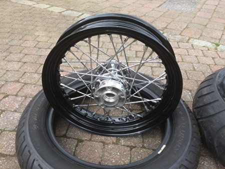 Harley cross bones velgen met banden in prima staat.voorvelg 16" x 3" met voorband (130mm) harley Dunlop D402F MT90B16 72H