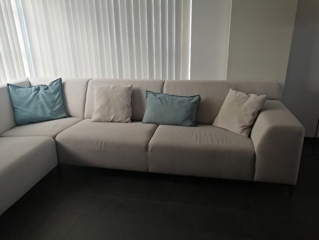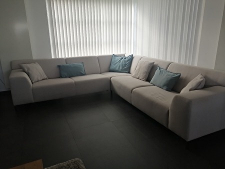 Hoeksalon in stof. 2m90 x 2m70 x 90cm diep...Licht beige kleur...Met kussens..moet weg wegens verhuis..