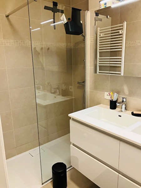 De badkamer is afgewerkt met grote muurtegels, een grote inloopdouche en TWEE grote lavabo's. Betegeld toilet.