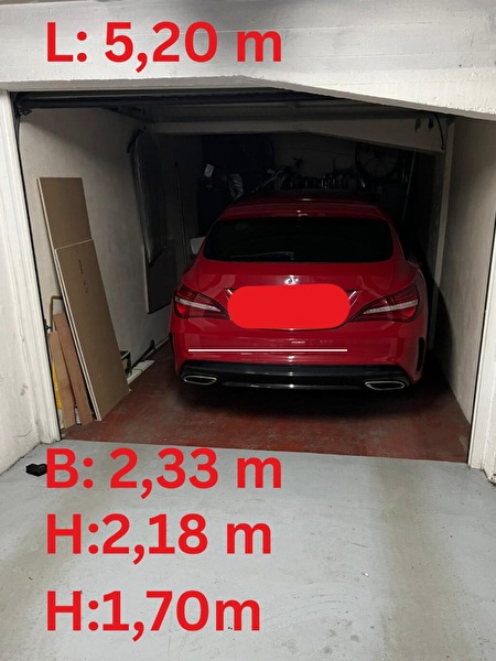 Afmetingen garagebox Nr79: breedte 2,33m, diepte 5,20m, max benutte hoogte 1,70m schuine kant, gewone hoogte 2,18m.