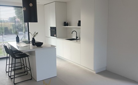 De strakke, hedendaagse keuken met eiland en composiet werkblad zijn een droom voor elke chef. Hier stelen volgende, kwalitatieve apparaten de show: een vaatwasser, koelkast, microgolfoven met grill en een inductie kookplaat met geïntegreerde afzuiging.