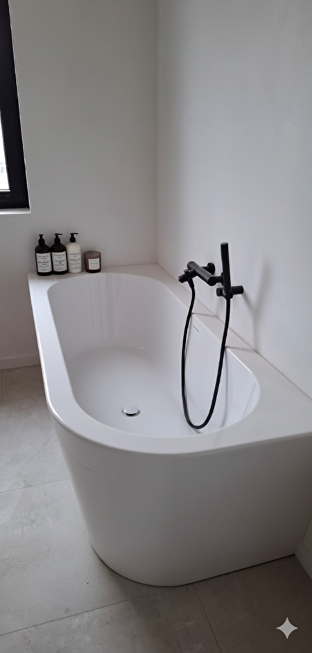 Grote Badkamer: Een oase van rust met een prachtig afgerond Acrylbad, een dubbel lavabomeubel, inloopdouche . Vanuit deze badkamer is er een directe toegang tot een wasluik dat rechtstreeks uitkomt in de wasplaats beneden!