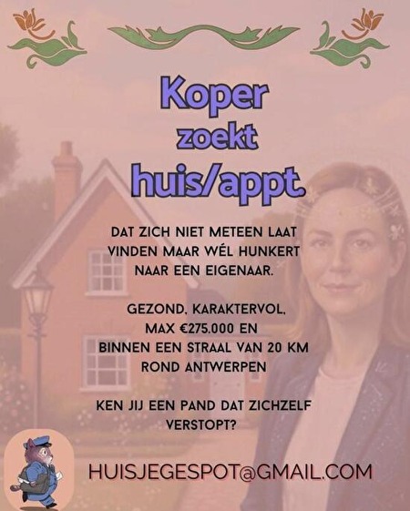 Ik ben op zoek naar een gezond huis of appt. (max 275.000 euro) binnen een straal van 25 km rond Antwerpen dat zich niet meteen laat vinden maar wel op zoek is naar een fijne eigenaar!
