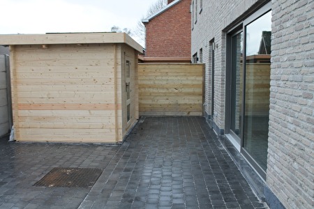 Terras met tuinhuis en oprit voor 2à3 wagens.