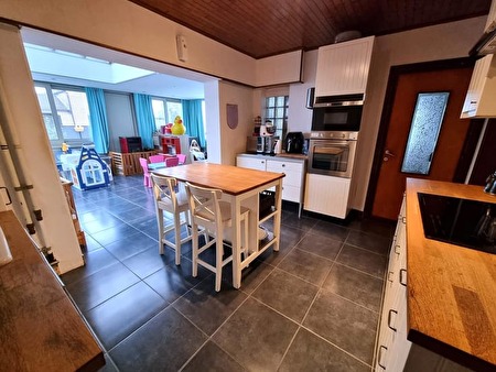 Ontdek deze instapklare en veelzijdige woning op een royaal perceel van 959 m² met een zuidwestelijke oriëntatie, gelegen in een centraal gelegen buurt met vlotte verbindingen richting Aarschot en Heist-op-den-Berg. Deze eigendom is perfect geschikt voor een groot gezin of voor wie wonen en een zelfstandig beroep wil combineren, dankzij de aparte toegang (momenteel ingericht als crèche/onthaalmoeder).Het gelijkvloers verwelkomt je met een inkomhal die toegang geeft tot de functionele, centraal gelegen keuken en een gezellige leefruimte. Aansluitend kom je in een zonnige leefveranda van 32 m² (vergund in 2011), momenteel ingericht als crèche, maar ook perfect als praktijkruimte of extra zitruimte.