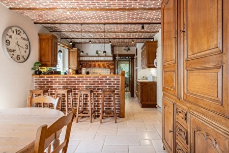 Inkomhal met open trap en vestiaire, ruime woonkamer (+- 35m²) met natuurstenen schouw en houtcassette, ingerichte keuken met ontbijthoek en toegang tot een 2de leefruimte / veranda, bureau (mogelijkheid extra kamer), WC, wasruimte, grote garage en prachtig glazen bijgebouw met zwembad (10m x 5m, kleedruimte, douche en WC).
