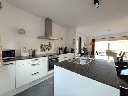 Ruime leefruimte met houtkachel en uitgang naar het terras (18m²), uitgeruste keuken en reserve, technische ruimte, aparte WC.