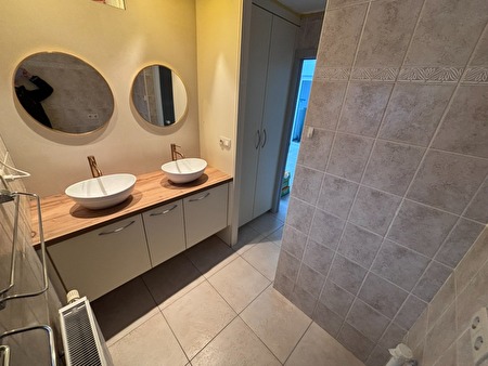 De inkom geeft toegang tot de zeer ruime leefruimte waar aansluitend de ingerichte, lichtrijke keuken (dampkap, kookplaat, koelkast/diepvries) en aparte berging terug te vinden zijn. De keuken is ruim en biedt plaats tot een eetruimte. Ook is er een volledig ingerichte badkamer voorzien van dubbele wastafel met meubel, douchecel, aansluiting wasmachine en toilet.