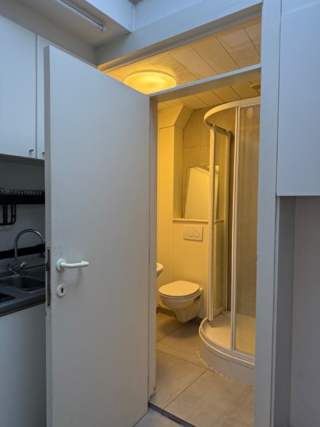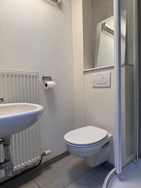 gelijkvloers - woonruimte, kleine keuken, ruimte met douche, toilet en lavabo