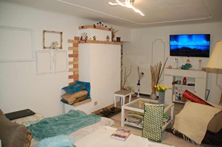 hoger gelegen woonkamer die verwarmd wordt met een bakstenen kachel. Naast