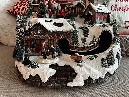 volledig kerstdorp met treintje en verlichting.klein foutje door stilstend