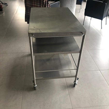RVS trolley op wielen. 1.00 cm breed, 0,57 cm diep en 0,86 cm hoog. Zelf af te halen.