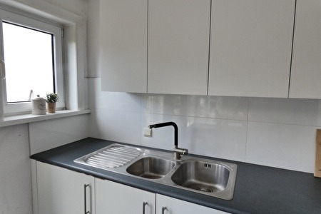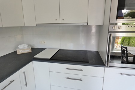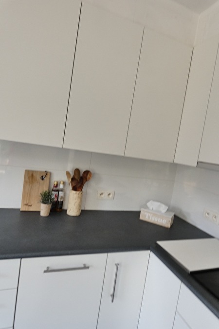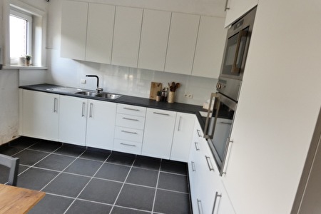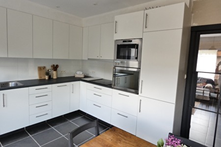 Heel ruime voorraadkasten. Werkblad is grijs/mandarin stratifié, maar kan gerust vervangen worden door een ander werkblad naar keuze bv. natuursteen of graniet, afmetingen L-vorm 3,35 m op 2,90m. Reden verkoop is volledige renovatie. Kan bezichtigd worden.