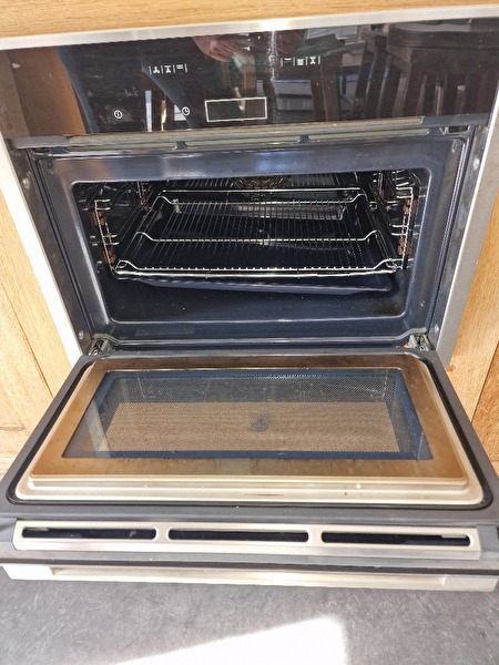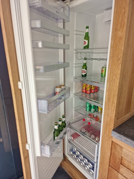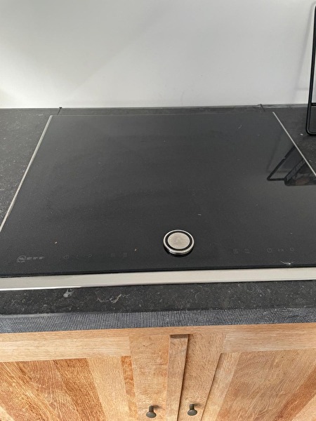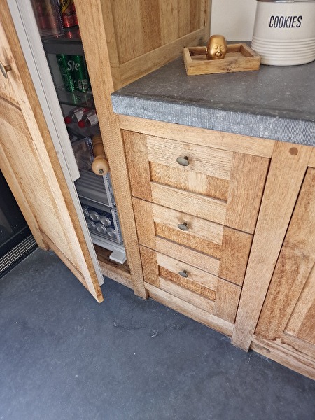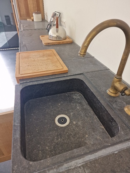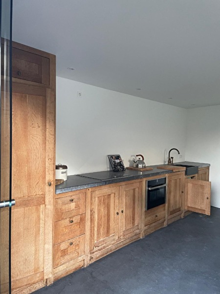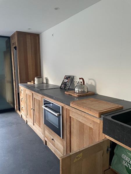 Massieve eiken keuken werkblad van 5 cm arduin,pompbak eveneens uit arduin.Inductiekookplaat neff. Warme lucht oven neff. Ingebouwde koelkast Keuken zelf uit elkaar halen en op halen .