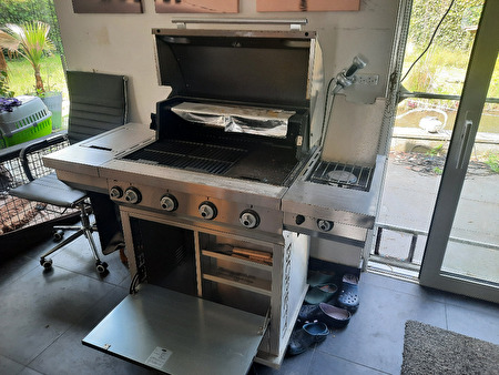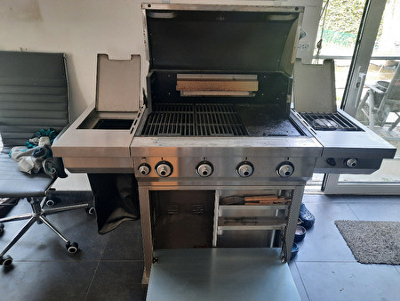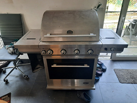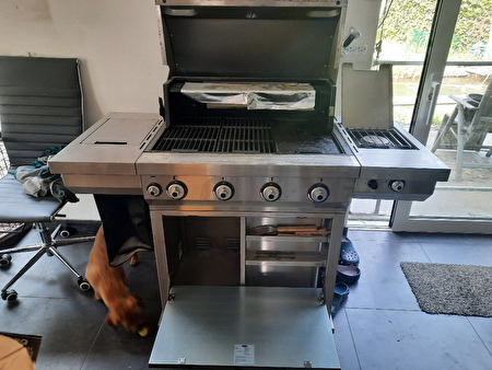 Mooie gasbarbecue merk Boretti. Met vier branders + zij-brander en vuilnis-opvangzak. Amper vier maal gebruikt. Mag wegens niet meer gebruik (leeftijd). Nieuwprijs plus minus 900 €. Nu aan halve prijs. Zeer mooi en praktisch. Kan ook buiten gebruikt worden. Met barbecue afdekzeil.prijs : 450 €
