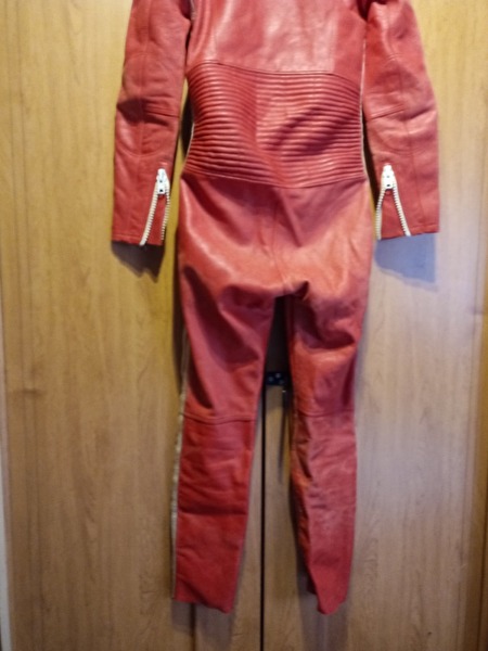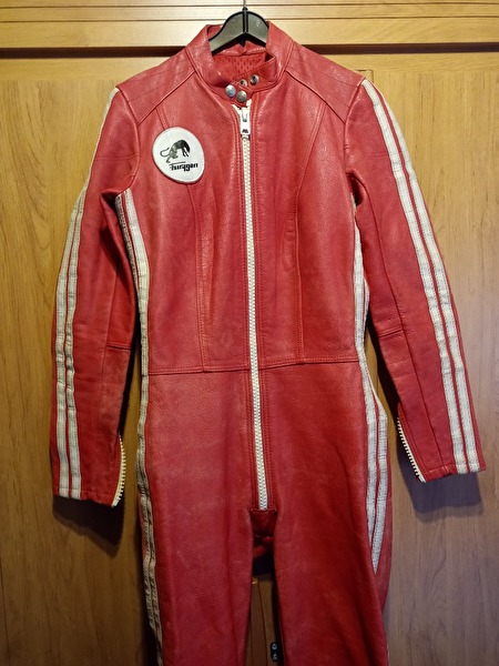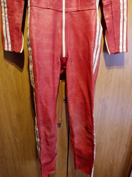 Red and white vintage Furygan leather motorcycle racing suit. For slim body.
