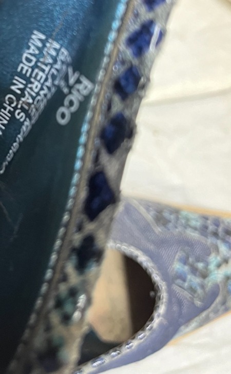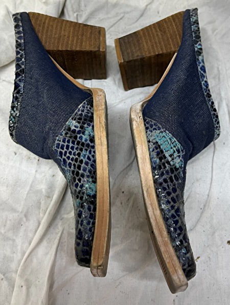 Cowboy muiltjes, me too, blauw/bruin, maat 7 1/2 (39 eu), muiltjes hebben herstel nodig aan de kleine barstjes aan de onderkant.