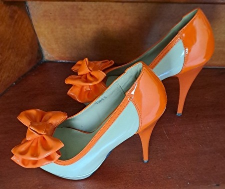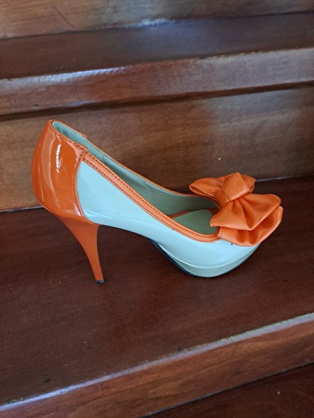 Mooie en elegante pumps. Hak van 12 cm. Beige en oranje. Mooie grote oranje strik. Maat 36