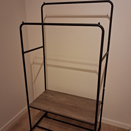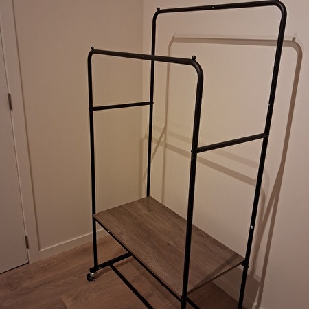 Nieuwe kledingrek op wieltjes. Dubbele hangrek met legger.