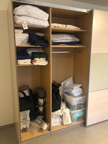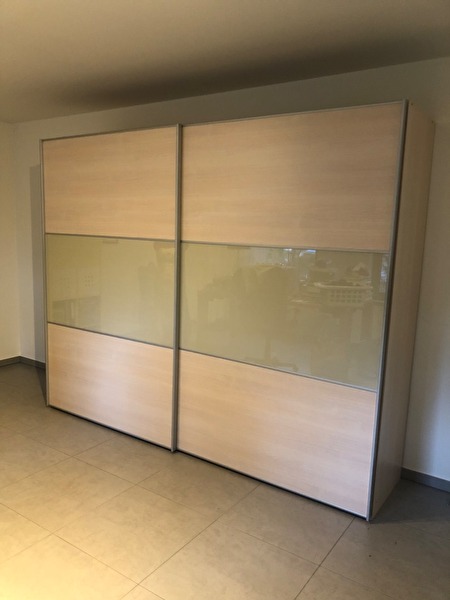 Een lichteiken met melkglazen panelen kleerkast met schuifdeuren.