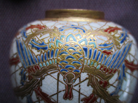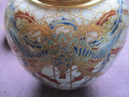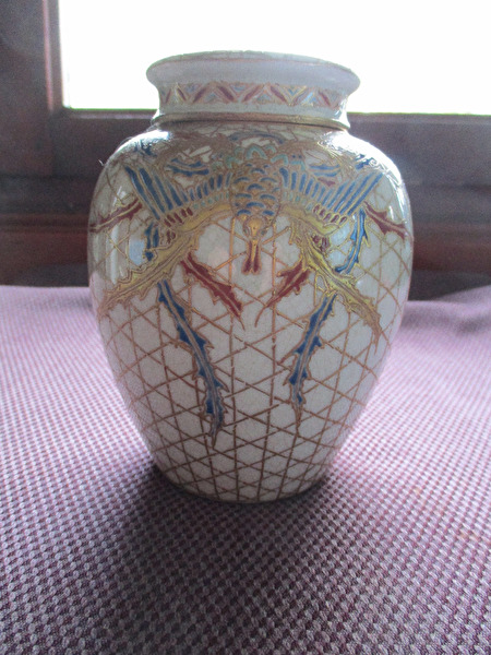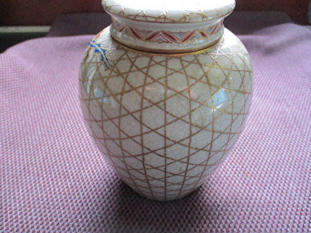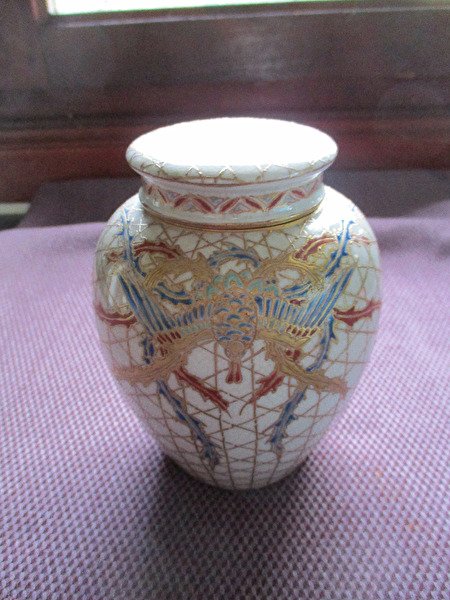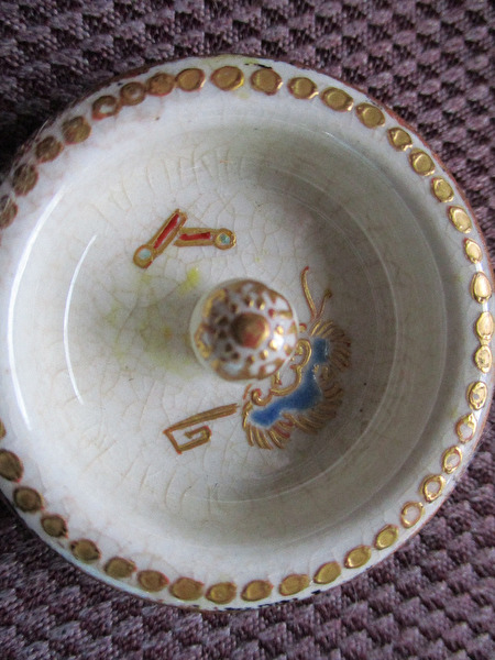 Prachtige antieke Japanse theebus,compleet met 2 afsluitdeksels.Nog in bijzonder mooie staat,met minimale gebruikssporen.Heeft steeds in een vitrinekast gestaan.Werd door mij aangekocht,anno +/-jaren '70 op een Antwerpse Antiekveiling.De kunstschatter vertelde mij toen,dat het hoogst uitzonderlijk was,dat bij deze soort theebussen het binnendekseltje nog aanwezig was.In de meeste gevallen was het verloren geraakt of gebroken.Zéér mooie glazuurlaag met gouden lijndecoratie en vermoedelijk vogelfiguur.