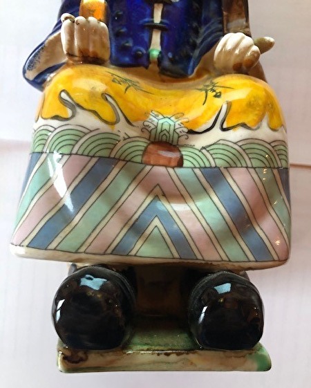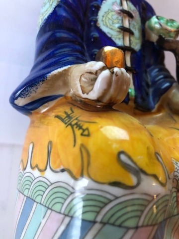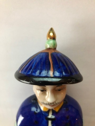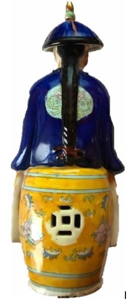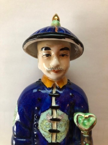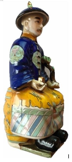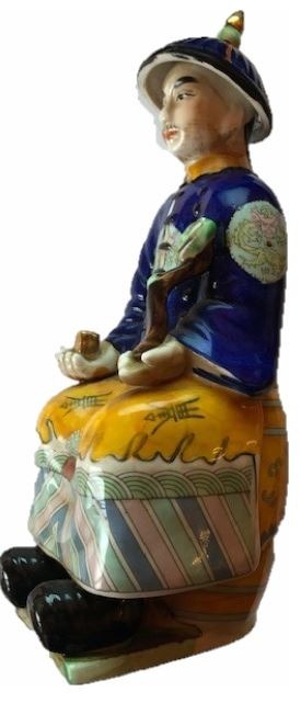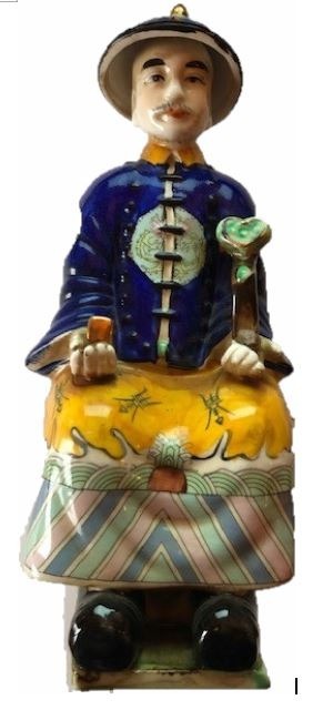 Chinees porseleinen beeld van keizer Yongzheng die regeerde van 1723 tot 1735. Handbeschilderd in onder meer kobaltblauw en okergeel.Prachtig en authentiek beeldje met op de onderzijde een ingedrukt merk; Fu Jin Hui Guan, ook wel Fujian Club genoemd. Dit atelier was gespecialiseerd in het met de hand beschilderen van beelden. Te dateren tussen 1950 en 1975.