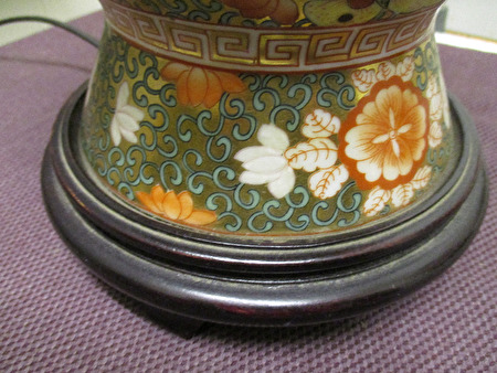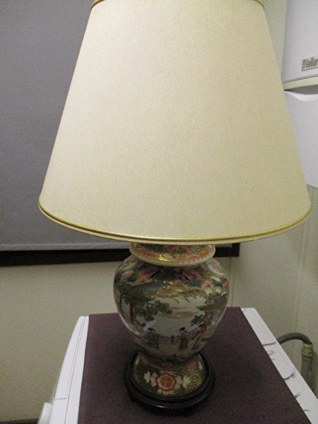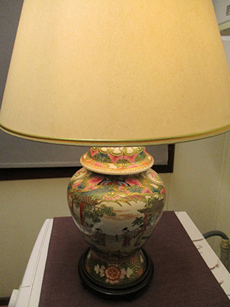 Prachtige Chinese Vintage tafellamp in porselein Familie Rose,voorzien van hand geschilderd kleurrijk decor.Kompleet voorzien van lampenkap.Vermoedelijk Vintage anno jaren +/- 1980/1990.Kantonese Familie Rose.Bovenaan voorzien van vijsje,waarmee men de lampenkap enkele centimers hoger of lager kan laten zakken of verhogen.Afmetingen:Breedte x Hoogte(zonder kap)= +/- 24 cm x 39 cm.Hoogte met kap= +/- 71 cm.Gemonteerd op houten sokkel.Gezien de leeftijd,nog in zéér mooie,gebruikte staat,met minimale gebruikssporen.