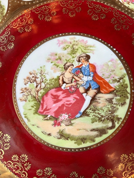 Vintage porseleinen sierbord beschilderd met liefdesverhaal van Jean Honore Fragonarddateert uit begin jaren 1950