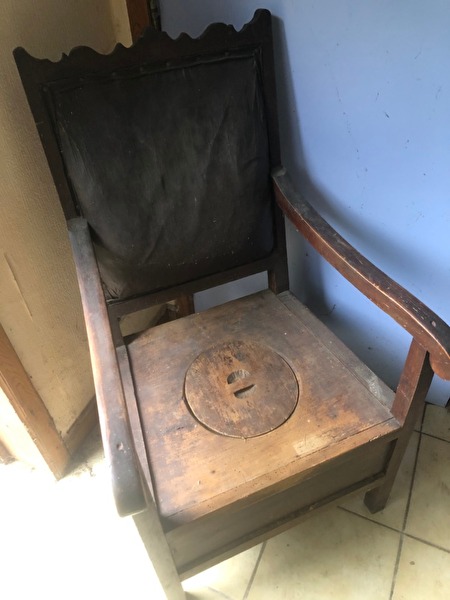 19de eeuwse houten armstoel - gemakstoel, bekleed met leder, afkomstig van oude hoeve.