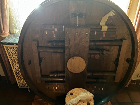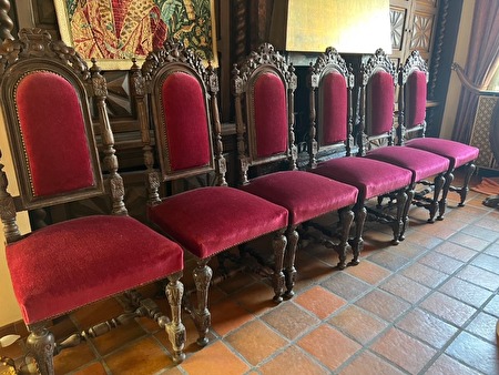 De jachttafel en de zes stoelen zijn in uitstekende staat en hebben een echtheidscertificaat. De tafel is uittrekbaar en beschikt over uitklapbare poten voor steun in uitgetrokken toestand. U kan drie extra panelen inleggen.