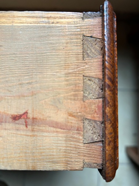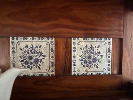 Onderkast met 2 schuiven en 2 deurtjes, tussenstuk met blauwe sier faience tegels. Schuiven met zwaluwstaartverbindingen.