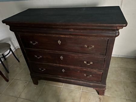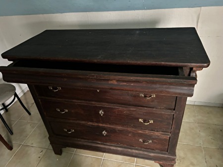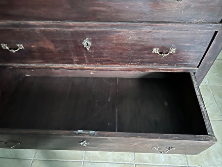 Commode met vier schuiven, uit olmenhout in sobere uitvoering.Deze houtsoort werd vroeger veel gebruikt voor meubels, schrijnwerk en rijtuigen. Olmenhout is vrij hard, grof, taai en duurzaam.