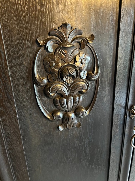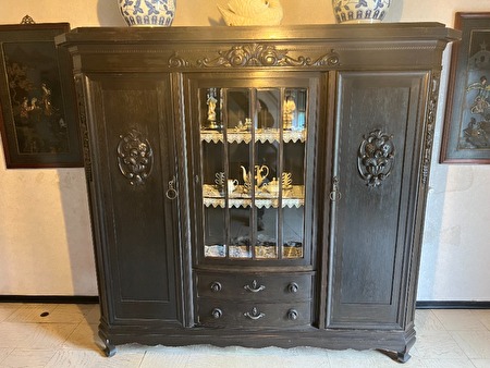 Grote kabinetkast in zwart hout met vitrine middenstuk, 2deuren en 2 laden.Mooi bloemmotief in relief op deuren