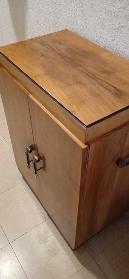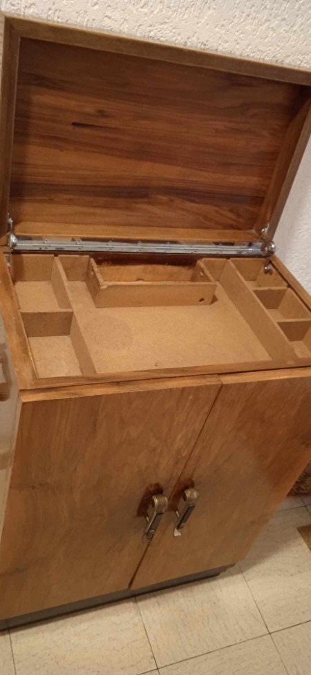 Kastje hout art deco ,orginele handvaatjes ,barkastje en kan ook gebruikt worden als tv kastje ,gaat bovenaan open