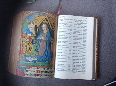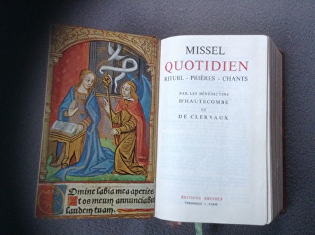 B = 10 cm ; L = 16 cm ; D = 5 cm ; het boek is in het frans geschreven , met klein zakje voor paternoster erin te steken ; met mooie illustraties en tekst ,er 2 paternosters met kruis en ééntje met een medaille van de heilige Maria,het is een MisVesper boek ; 2402 Blz ,