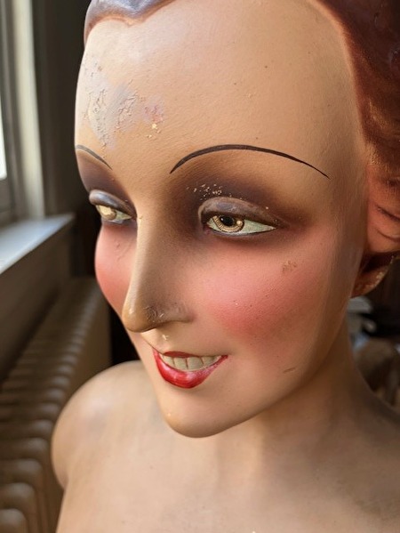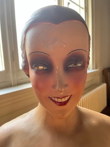 Zeer charmante etalagepop uit een corsetwinkel, daterend uit het begin van de 20e eeuw. De pop heeft bruine haren en een stralende lach, waarmee zij destijds klanten wist te verleiden tot een blik in de etalage. Een prachtig voorbeeld van vroeg-20e-eeuws winkeldecor en modegeschiedenis.