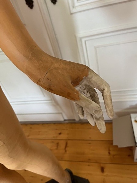 Conditie: restauratie aan de linkerhand, verlies van verf aan de linkerschouder en rechterbeen. Verder in originele staat met een authentieke, doorleefde patina passend bij de leeftijd. Maker onbekend.