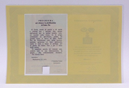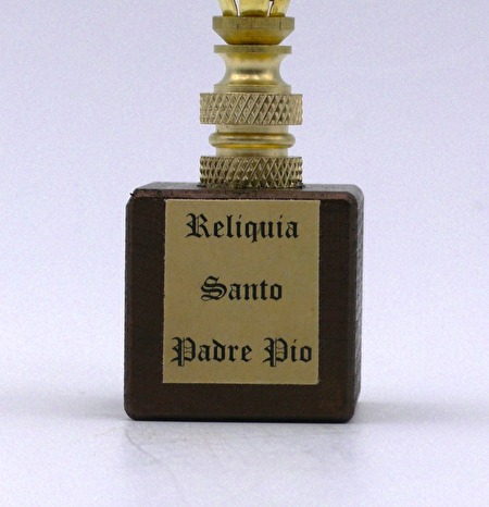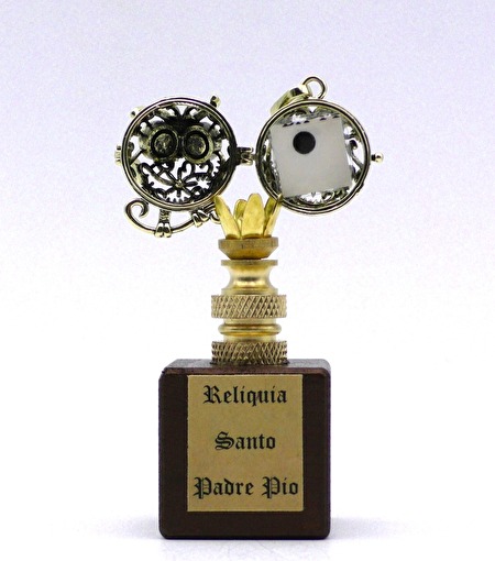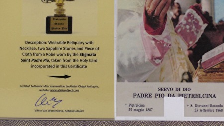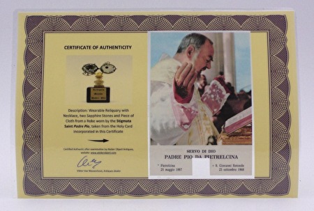 Heel bijzonder relikwie van de Heilige Padre Pio in de vorm van een klein stukje textiel van een door hem gedragen gewaad, bewaard in een kleine bolvormige relikwiehouder die kan gedragen worden als een juweel (hanger met halsketting).De hanger heeft twee echte blauwe Saffier steentjes...!