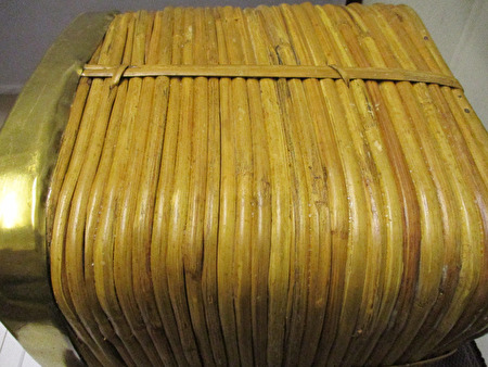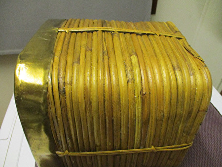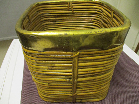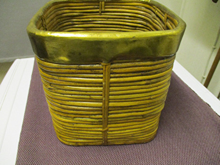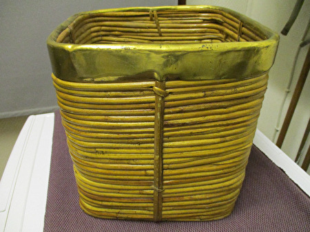 Bijzonder mooie,decoratieve rieten bamboe mand in de Italiaanse stijl van Gabriella Crespi,met koperen omranding.Vintage uit de jaren +/- 1960-1970.