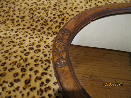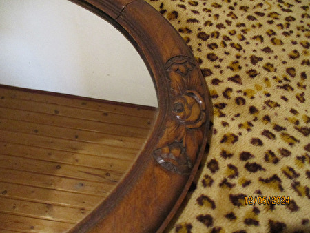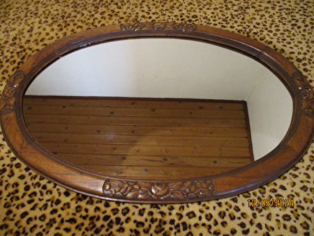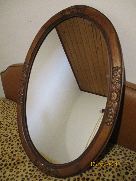 Antieke ovalen spiegel in eikenhout ,met op de 4 ornamenten decor van rozen met bladeren.Vermoedelijk anno +/- 1900 à 1920.Gezien de leeftijd,nog in zéér mooie staat met kleine gebruikssporen.Spiegel is nog zéér mooi.Bij één van de ornamenten,is er een miniscuul klein stukje af.Dit kan gemakkelijk bijgewerkt worden.Heeft vroeger altijd bij mijn grootouders gehangen.Afmetingen:Breedte x Hoogte = +/- 90 cm x 60 cm.Door de voorziene bewerking van deze spiegel,hebt u het voordeel van deze zowel horizontaal als vertikaal te kunnen ophangen.Dit geeft uiteraard extra voordeel.Oogvijzen voor ophanging zijn voorzien.Afhalen is mogelijk,na afspraak.Verzendingskosten ten laste van de koper,in overleg af te spreken.U mag steeds een redelijk bod doen.Mijn verzamelingen en inboedel,worden stelselmatig te koop aangeboden,omdat ik verhuisd ben en veel kleiner ben gaan wonen.